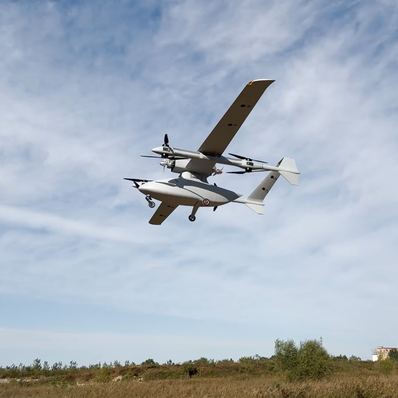 This is a vertical take-off and landing fixed-wing drone. With its powerful power configuration, it is endowed with an extremely long flight duration, ensuring a long-lasting and durable flight. The unique spliced structure design makes replacement and maintenance a breeze. It is applicable to fields such as emergency communication/rescue, video surveillance, aerial surveying and mapping, forest fire prevention, geological exploration, pipeline inspection, and cargo transportation.